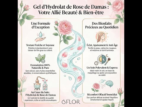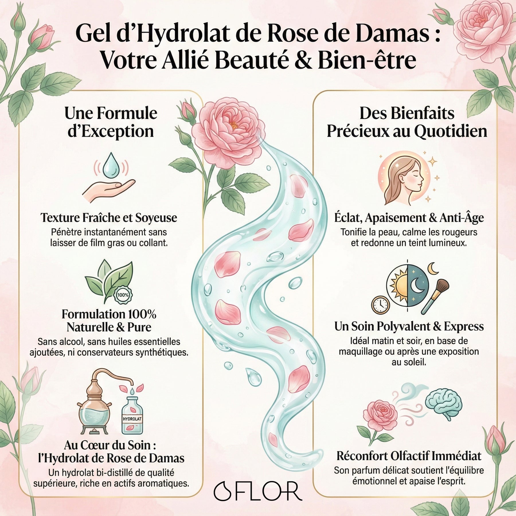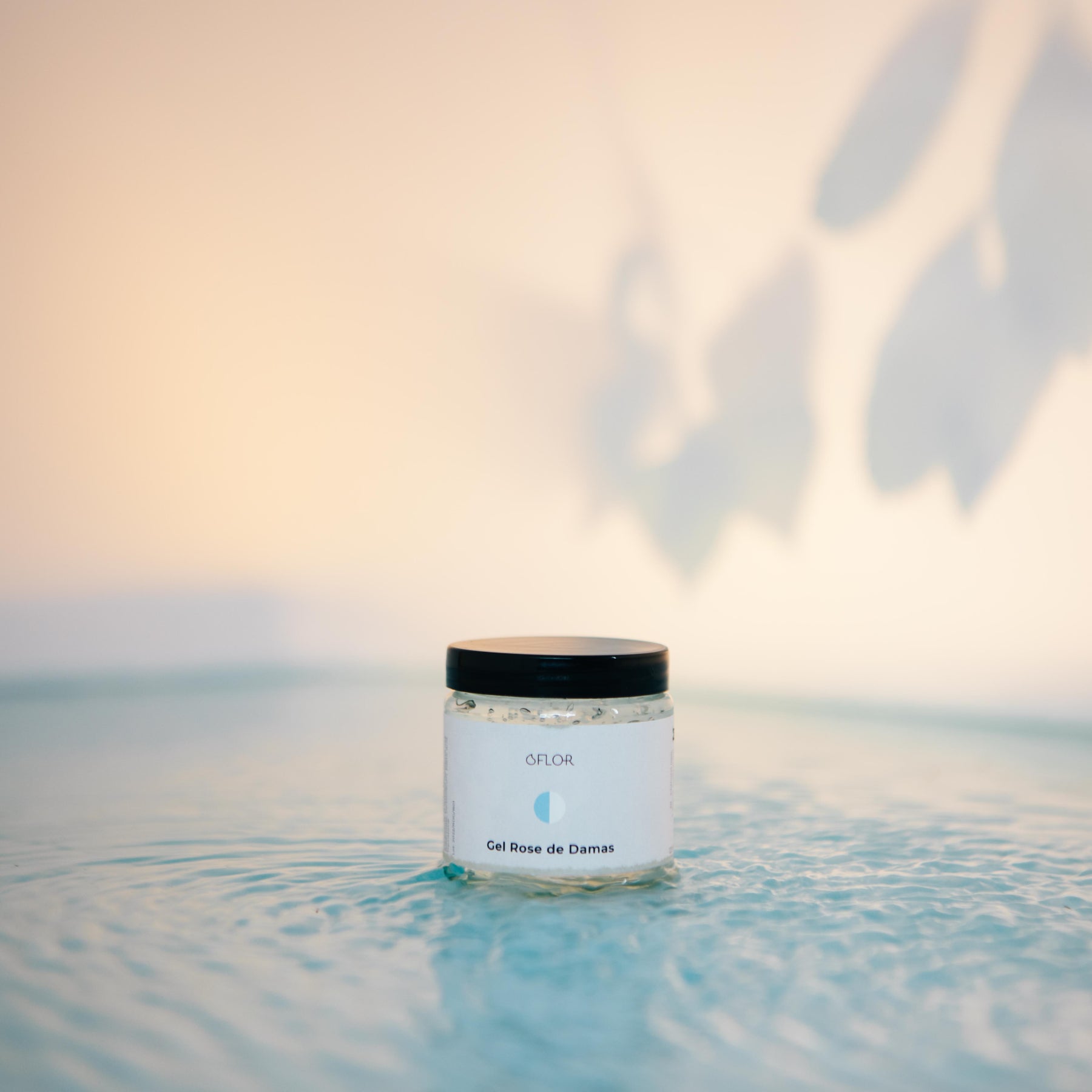 Gel d'hydrolat bi-distillé de fleur de Rose de Damas. Son parfum est très raffiné.